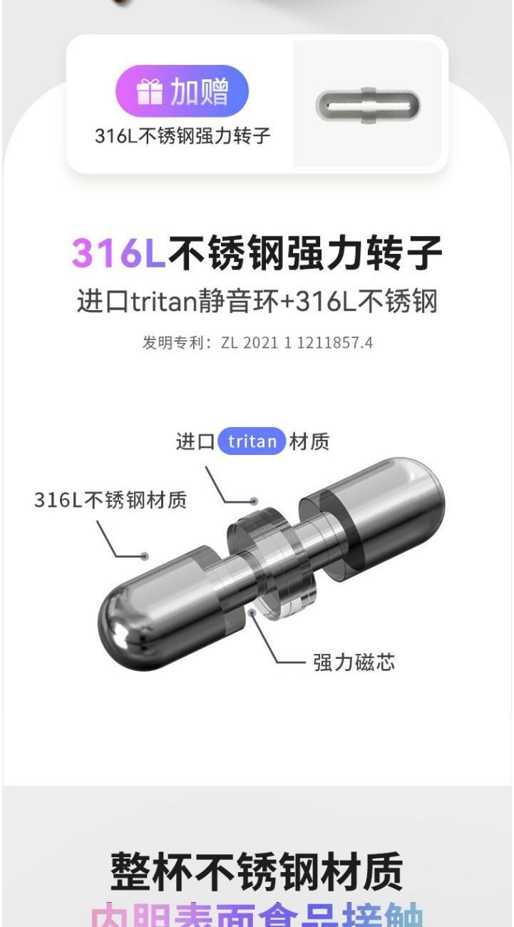 3.轉子:靜音轉子:進口tritan食品級材質,強力轉子: 3 1 6 不 銹 鋼 ( 進 口 tritan靜音環(huán)+316不銹鋼)