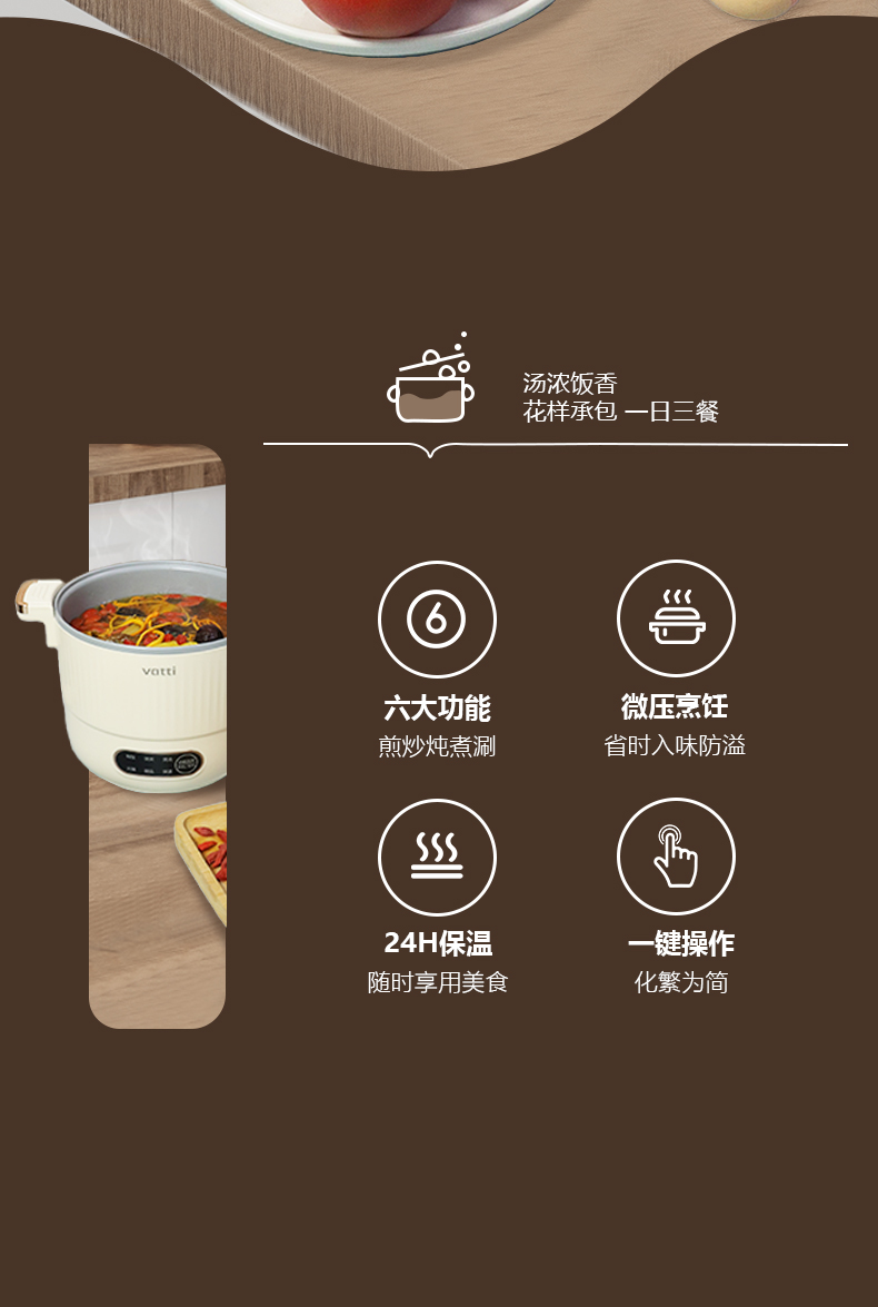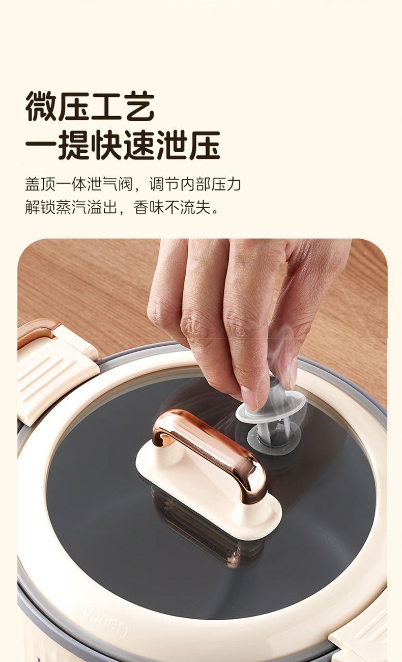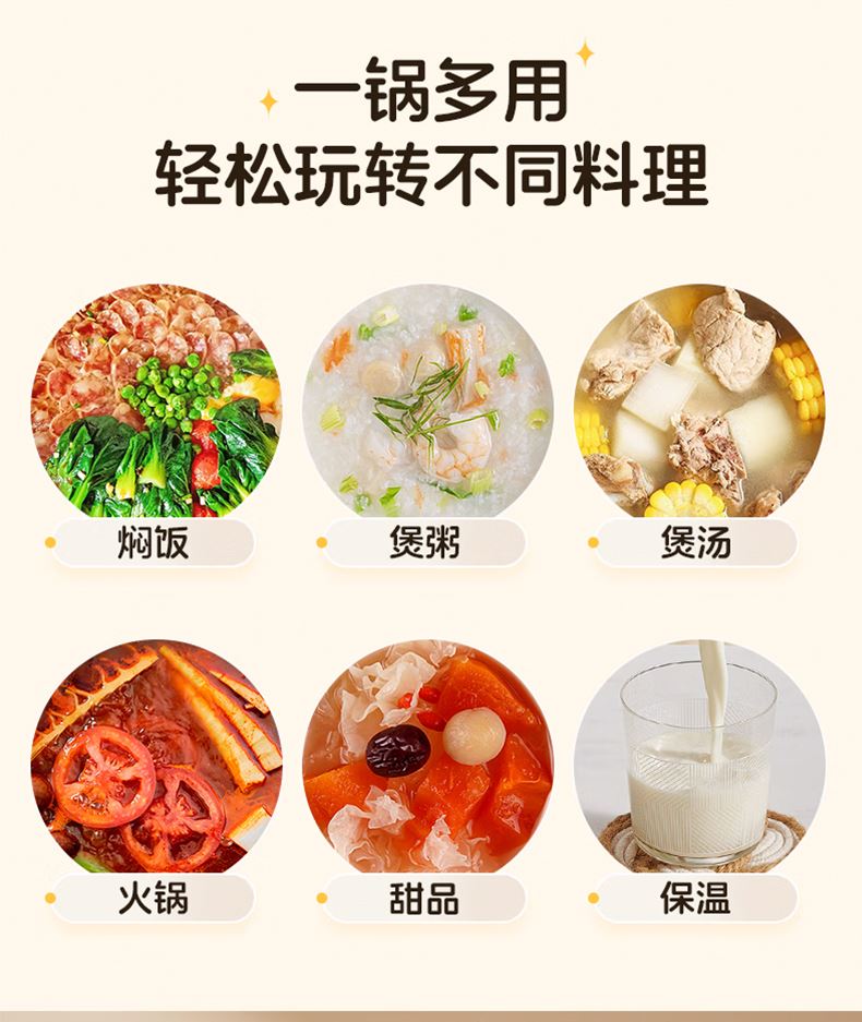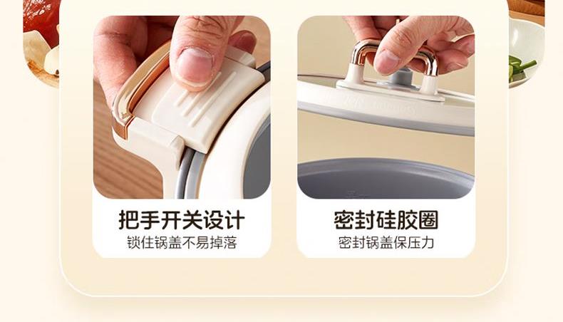 1.一鍋多用:壓力鍋、電飯煲、電煮鍋、電火鍋,以一抵四。 2.六大功能:頓頓新菜式,輕松玩轉花樣料理。 3.深鍋容量:可移動小廚房,滿足日常餐食需求。 4.密封性能:壓力內(nèi)循環(huán)烹飪,深度釋放營養(yǎng)。
