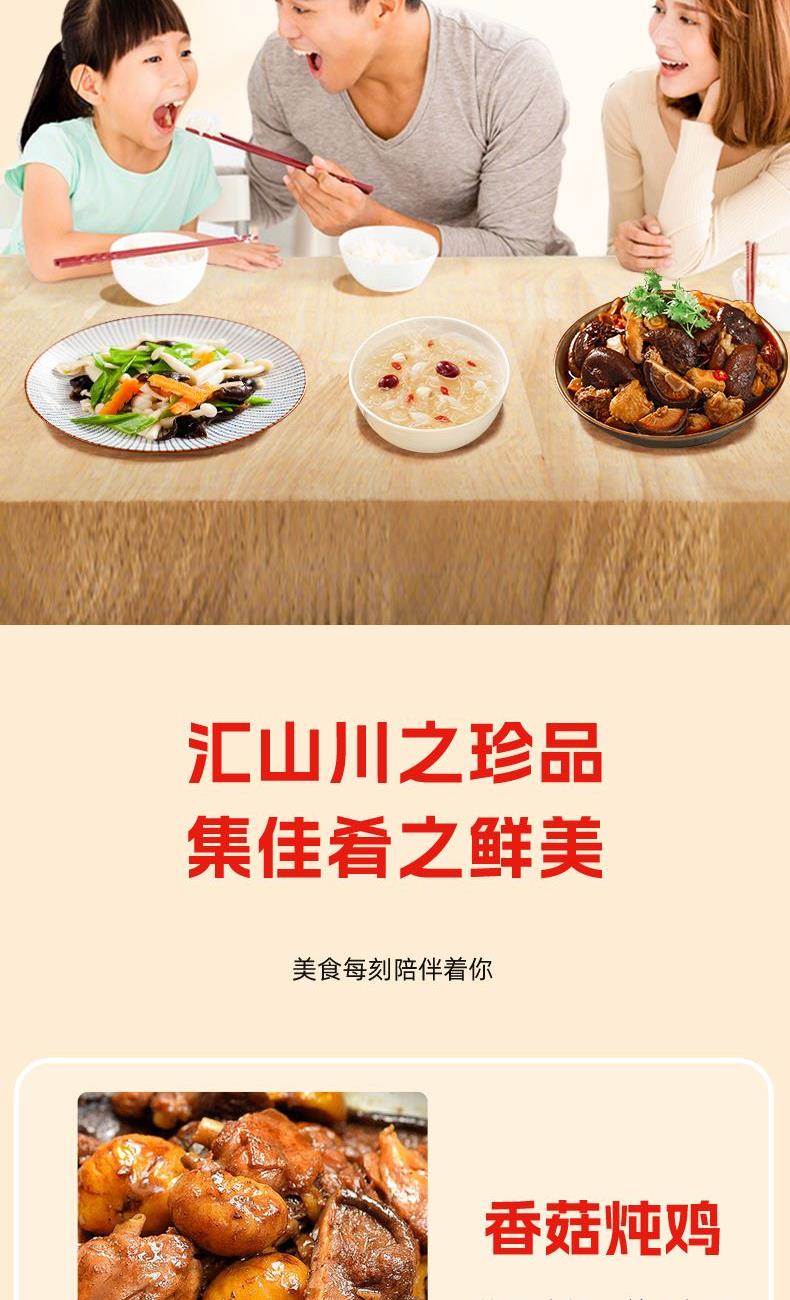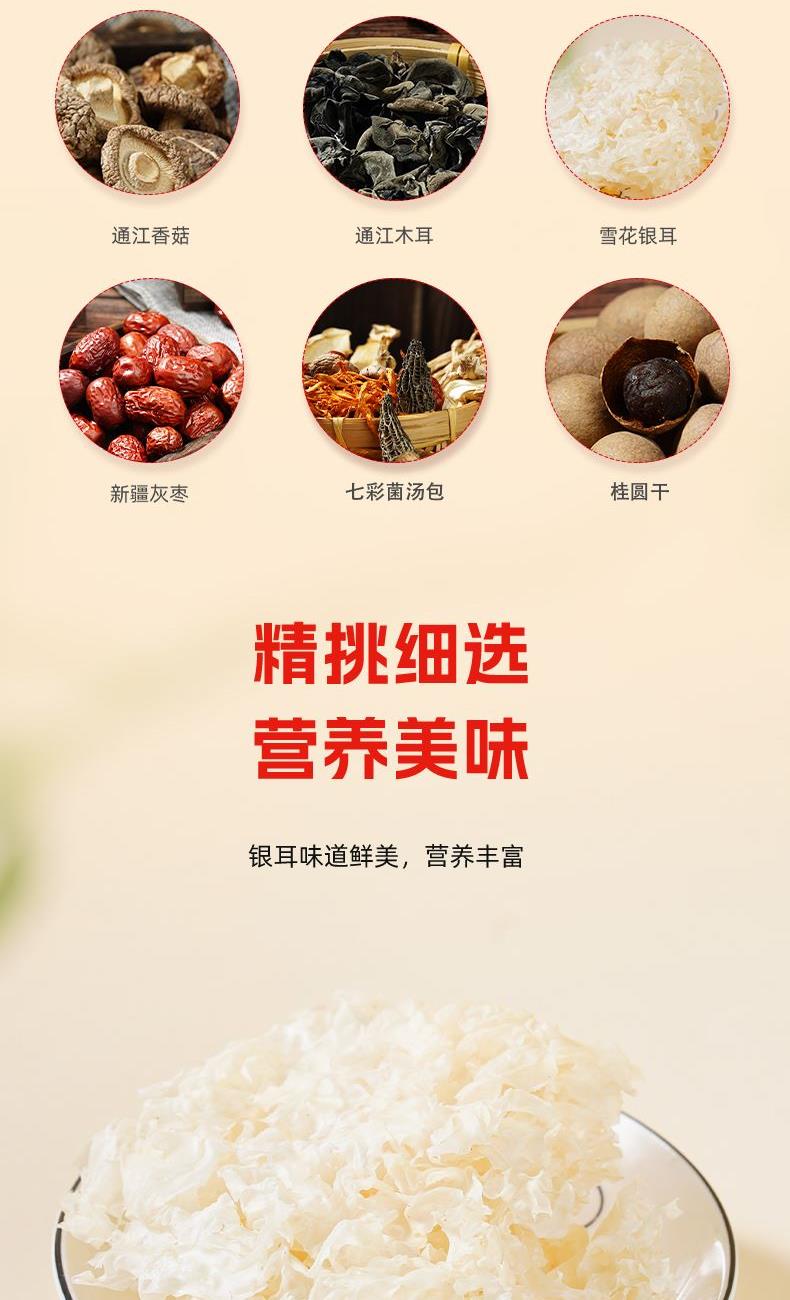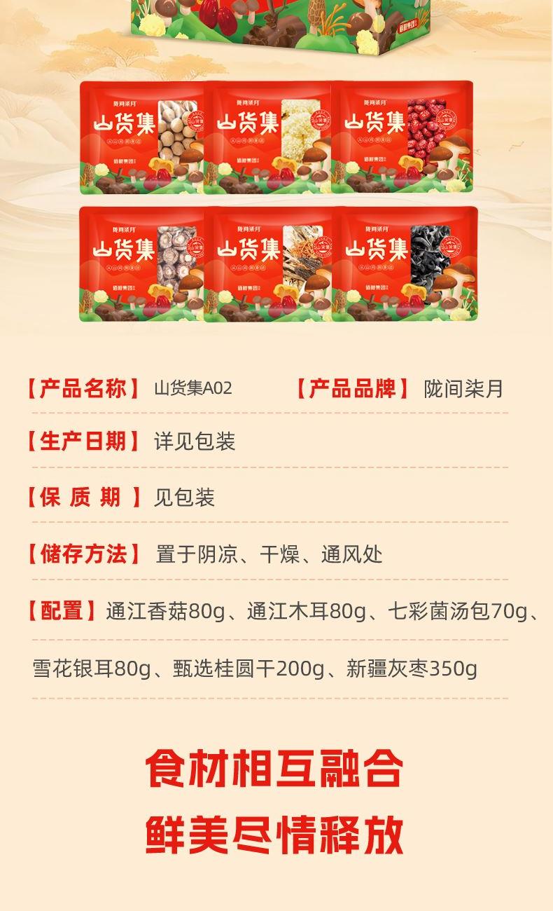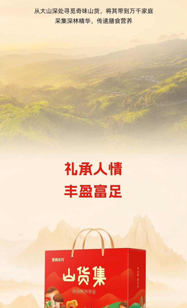 產(chǎn)品特色 1、從山間,到身邊,山珍禮盒,送禮臻品; 2、通江香菇:菇香濃郁、肉厚柄短,通江木耳:高泡發(fā)率、爽口脆嫩,菌湯包:包含多種山珍、煲湯佳品,雪花銀耳:軟糯多膠、朵大體輕,桂圓干:肉厚核小、果肉香甜,新疆灰棗:肉質(zhì)緊實(shí)、滋補(bǔ)佳品。