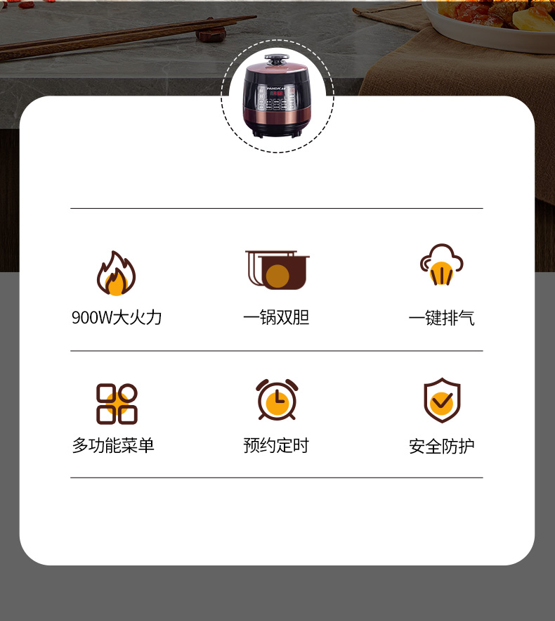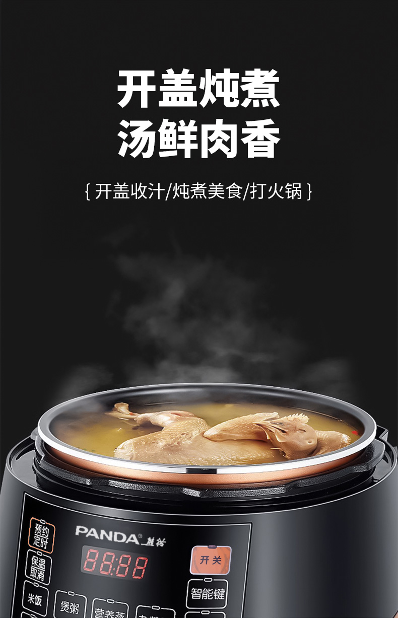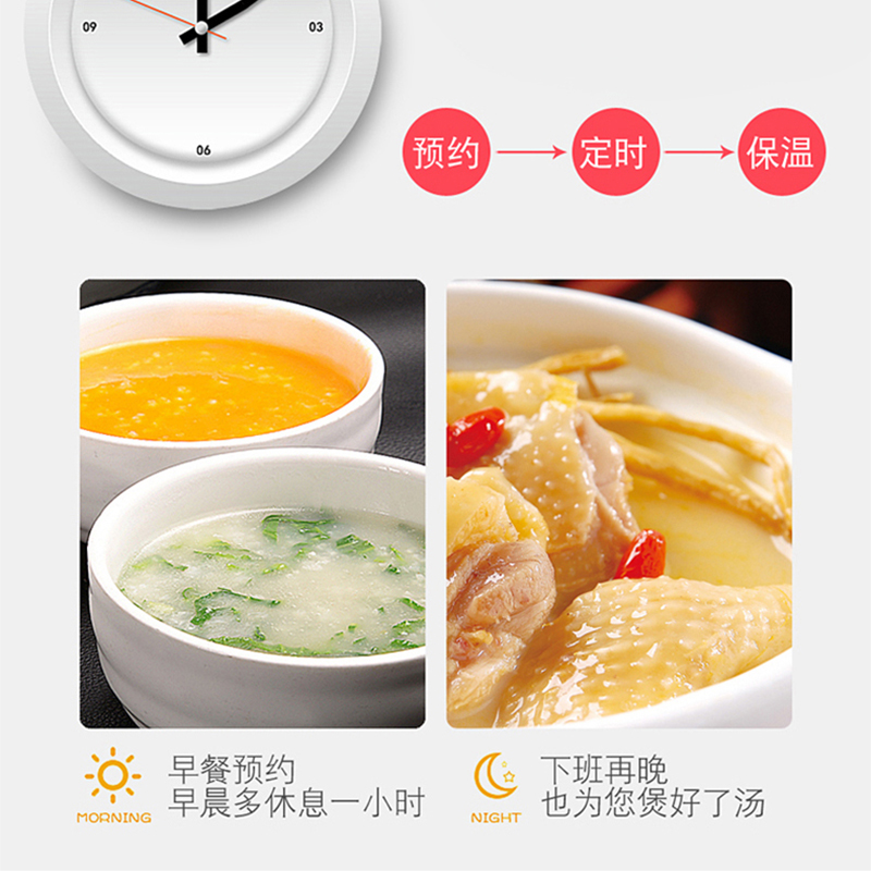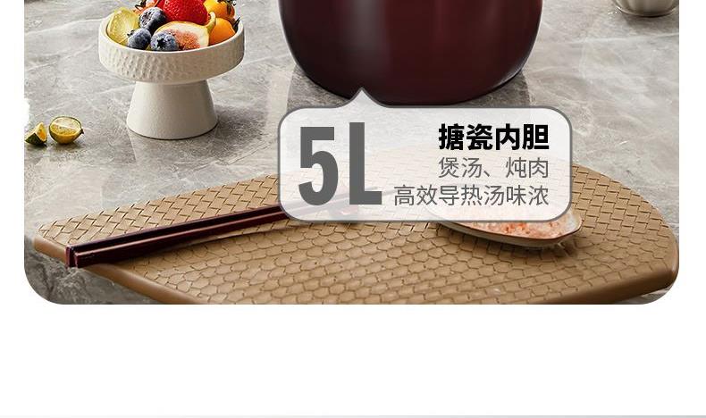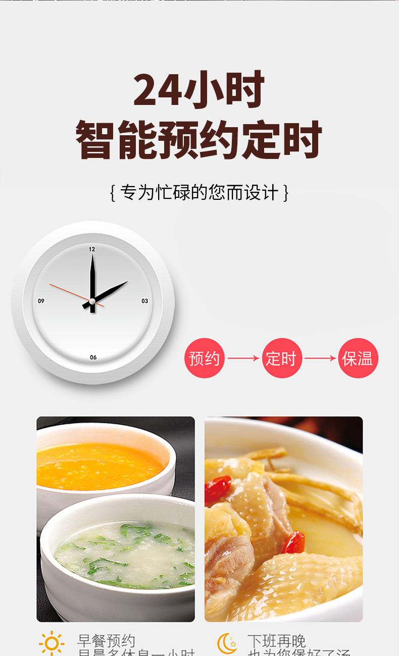 5L雙膽大容量,一鍋雙膽加厚不粘內膽(不粘糊,蒸米煮粥口感好)+搪瓷內膽(煲湯、燜燉肉類高效導熱湯香味濃) 900W大火力,美味不用久等 24小時智能預約,準時為您準備好飯菜 十大功能:煲粥、營養(yǎng)燉、雜糧粥、排骨、自動保溫、預約 升級防水按鍵屏,十大安全保證。