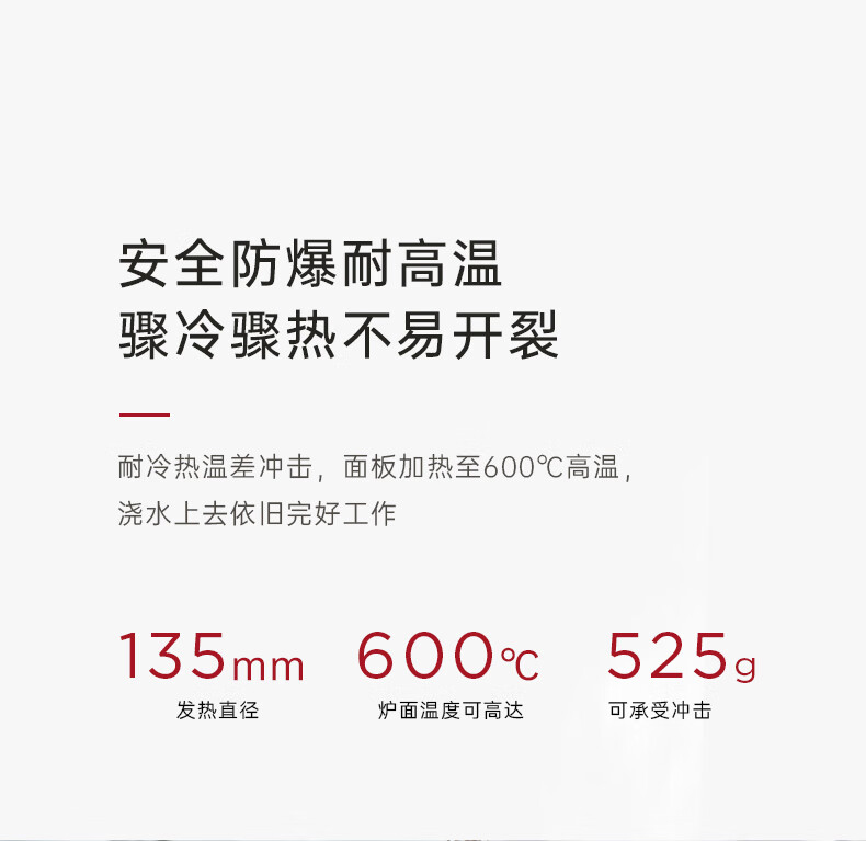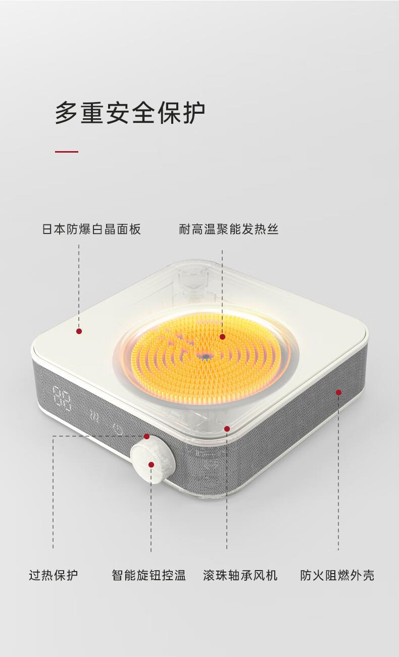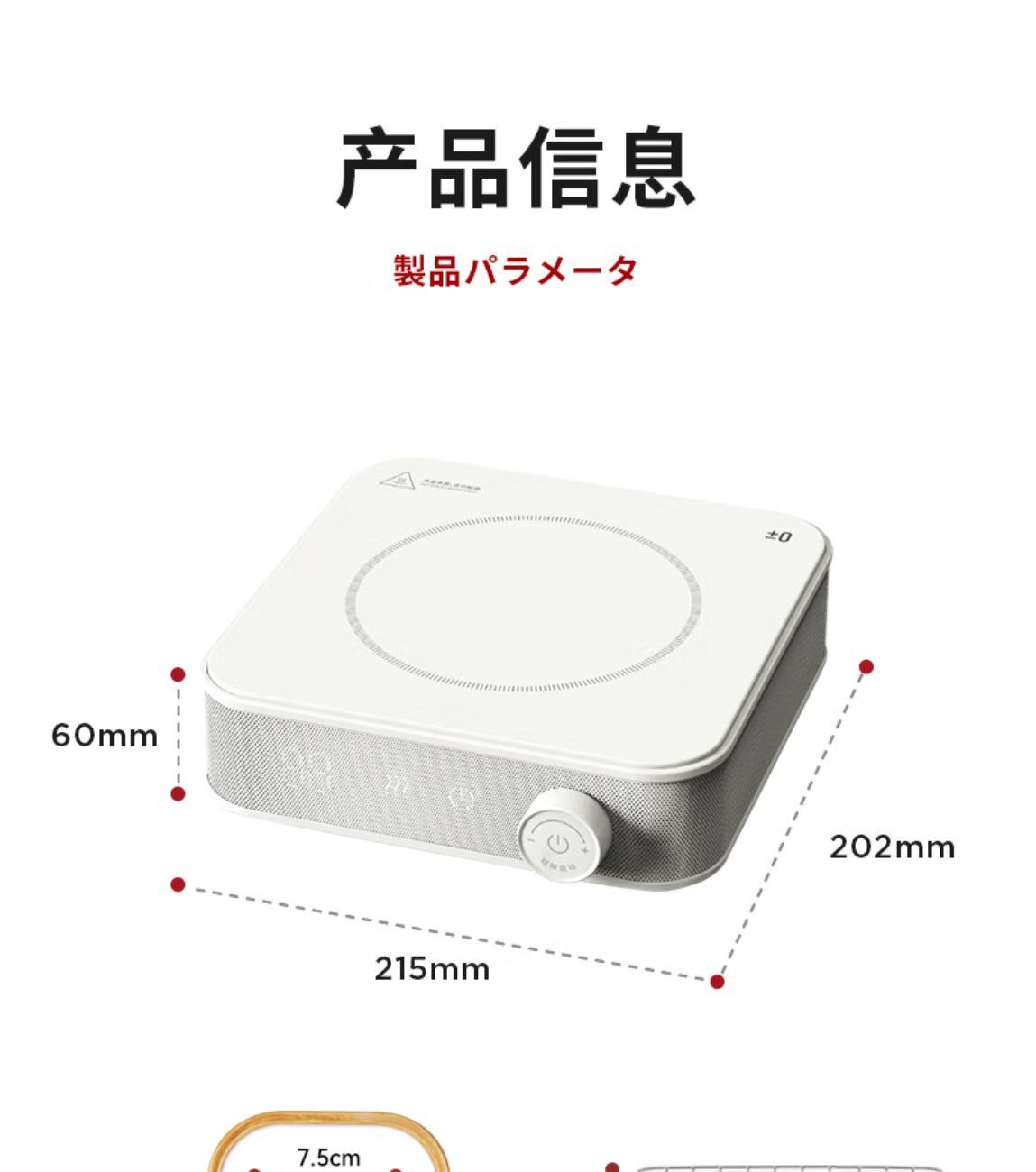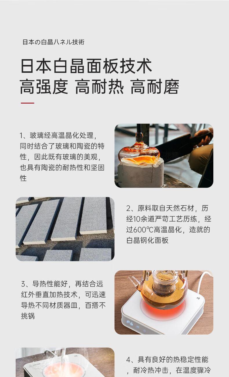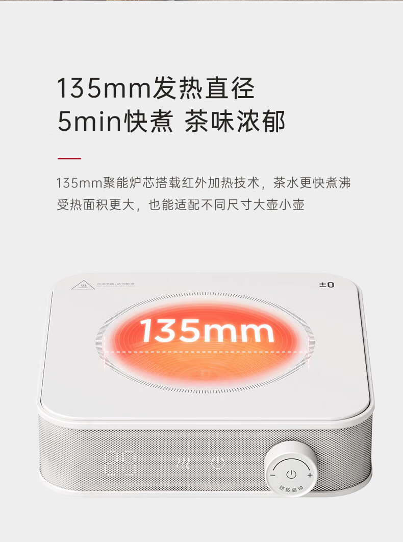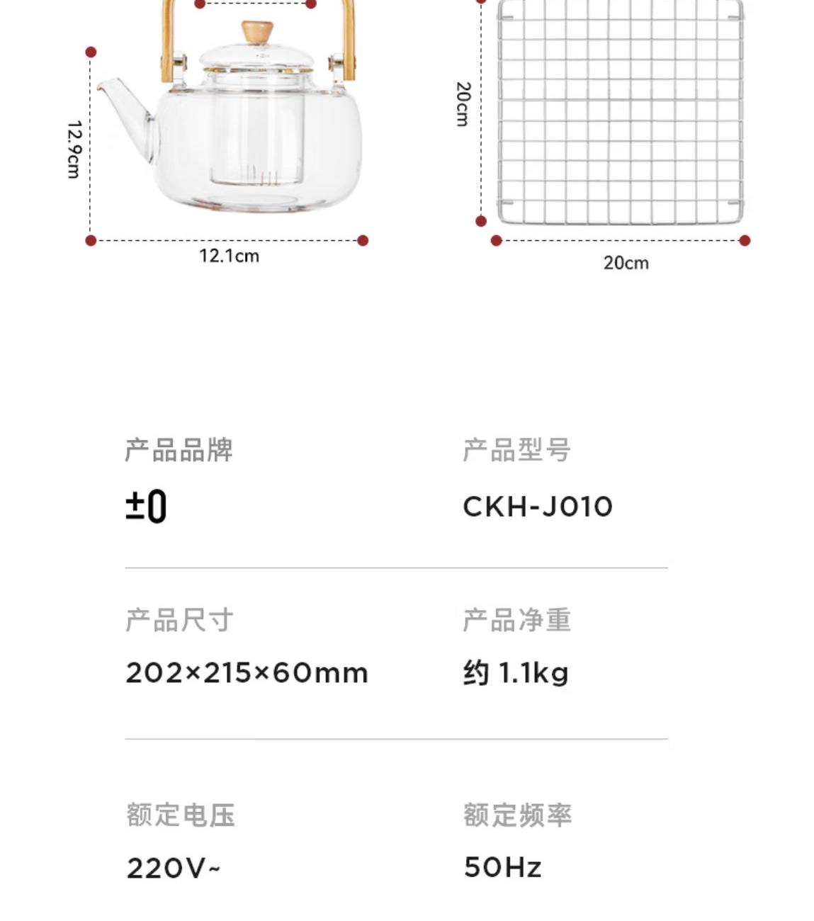 型號:CKH-J010 產品尺寸: 202*215*60mm 產品凈重:約1.1 kg 額定電壓:220V~ 額定頻率:50Hz 額定功率:1200W 可保溫時間:2小時 紅外聚能“垂直加熱”技術 隨心搭配,多壺適用 旋鈕開關靈活掌握火候 風扇靜音散熱壽命更長久