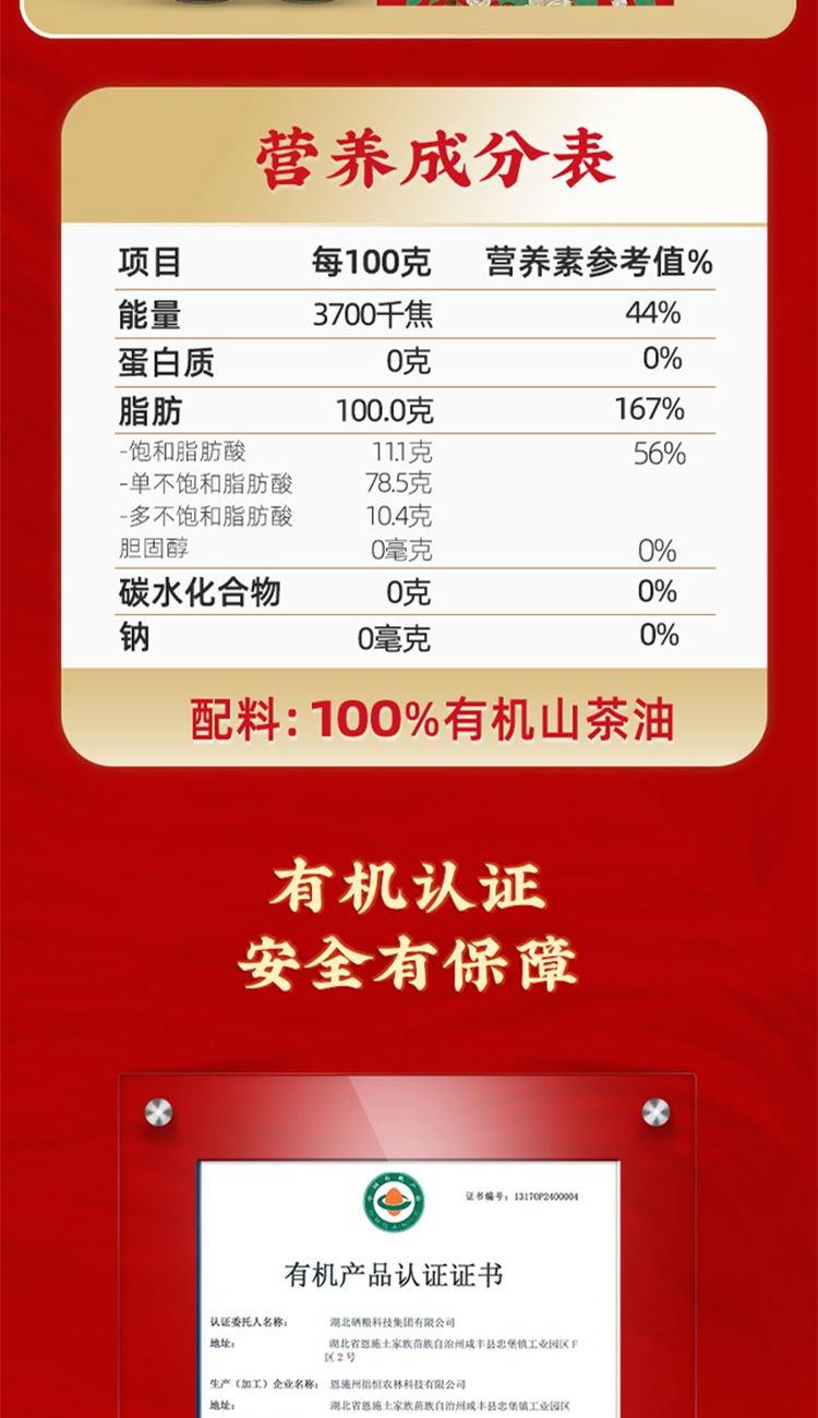 1、純正有機,物理壓榨,世界硒都,恩施原產(chǎn); 2、脂肪酸黃金配比1:8:1,符合歐米伽膳食食用油標準; 3、不飽和脂肪酸含量為88.9%,居所列食用油首位; 4、高煙點,少油煙。