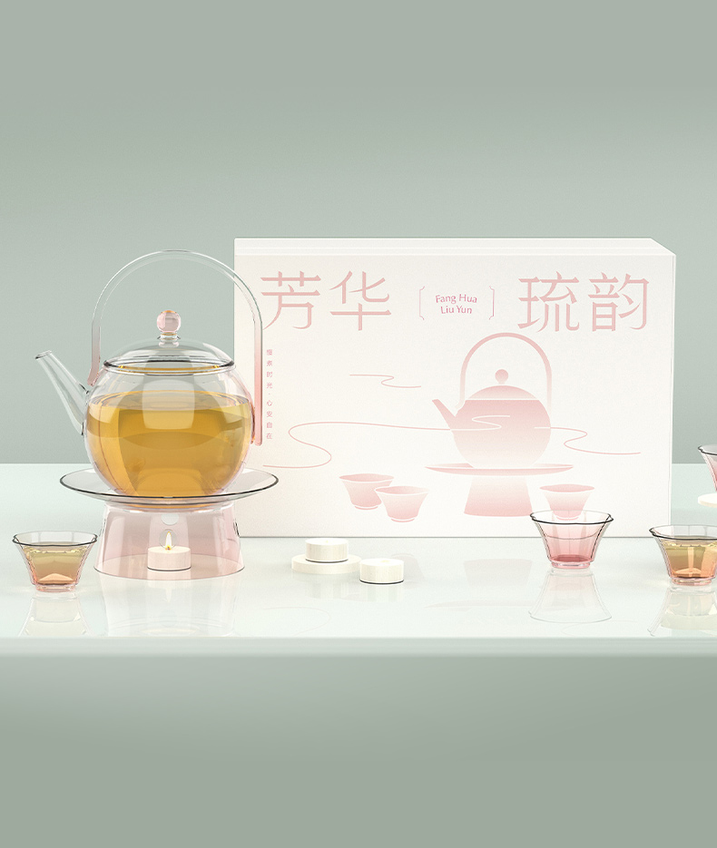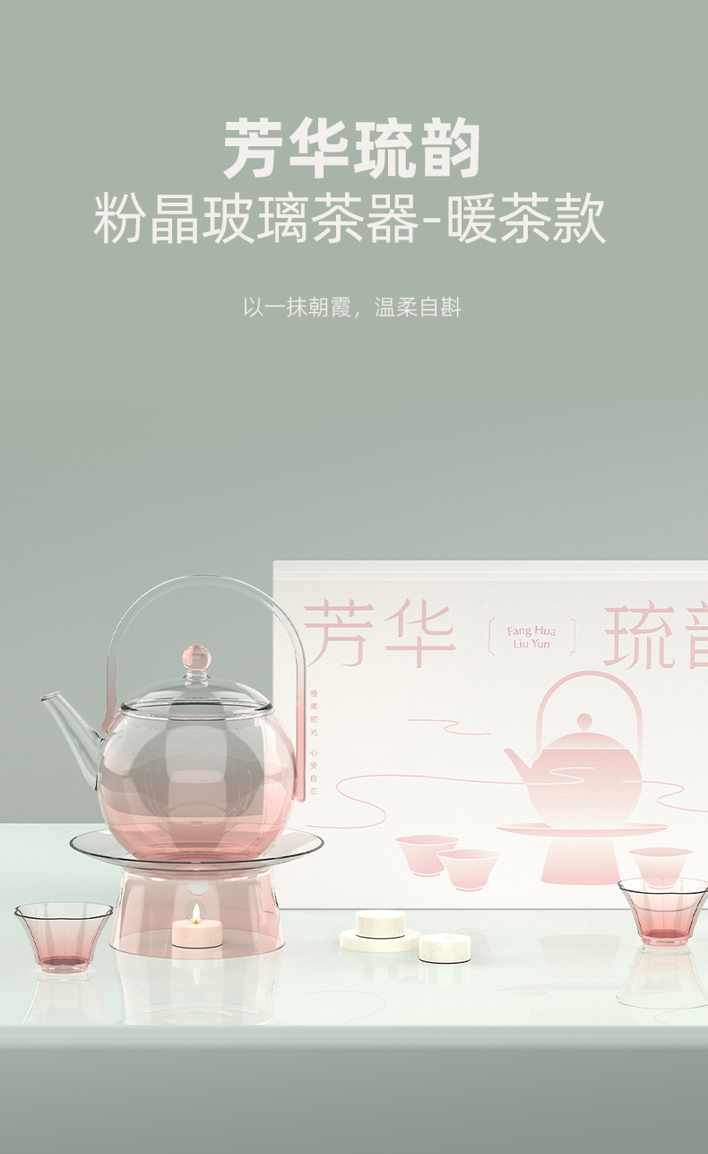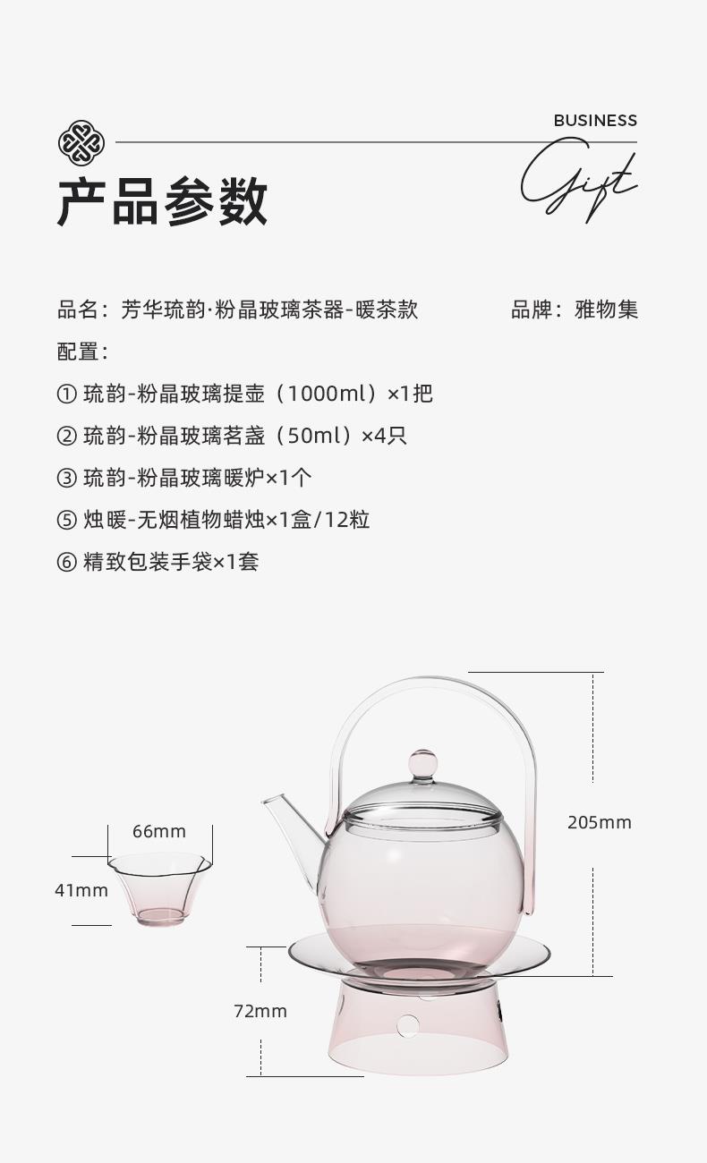 ① 琉韻-粉晶玻璃提壺×1把(1L) ② 琉韻-粉晶玻璃茗盞×4只 ③ 琉韻-粉晶玻璃暖爐×1個 ⑤ 燭暖-無煙植物蠟燭×1盒/12粒 ⑦ 精致包裝手袋×1套 是一爐燭火后的溫潤守候 也是指尖滑過的粉晶芳華 以恒溫暖意致敬職場女性內(nèi)心的堅韌與溫柔
