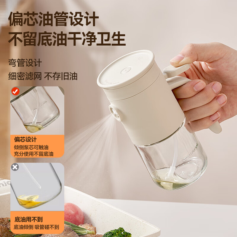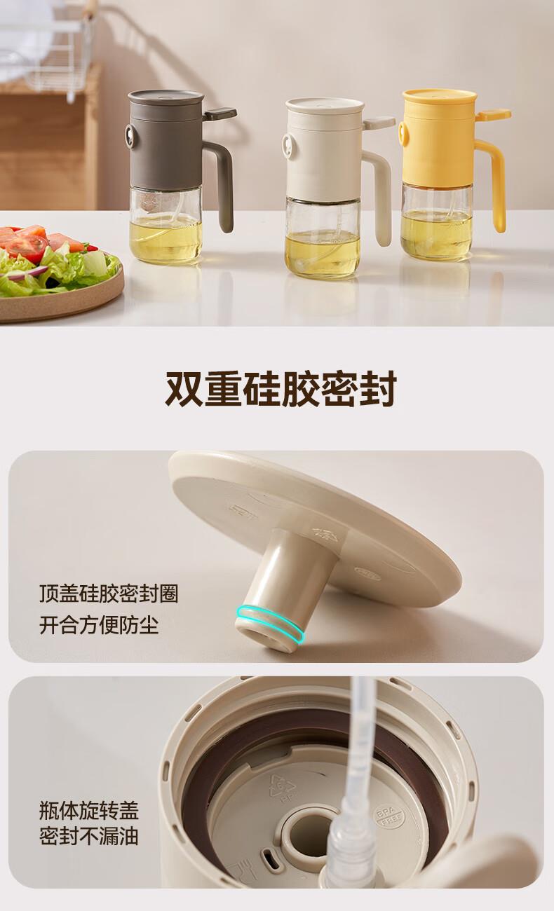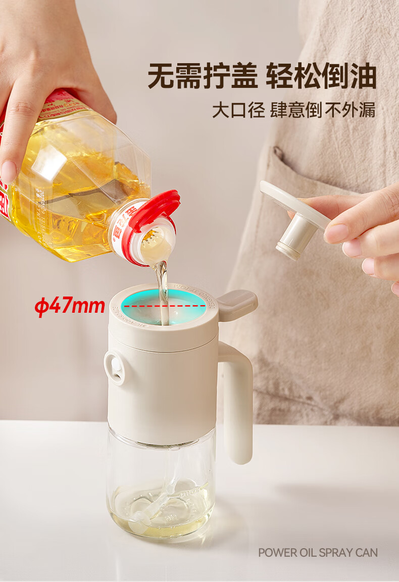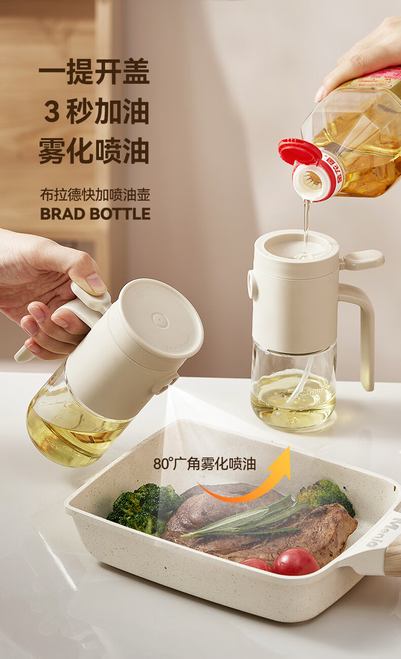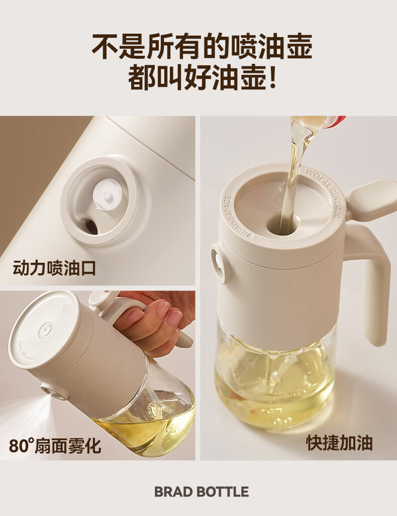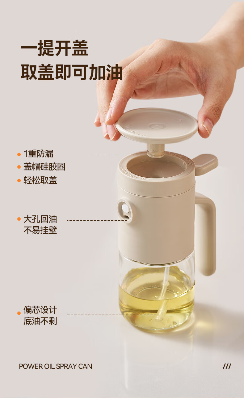 一提開蓋3秒加油霧化噴油 無需擰蓋 輕松倒油大口徑 肆意倒不外漏 “立體廣角噴霧”真正的均勻霧化 強壓下也能瞬時鋪開保持扇形黃金夾角 偏芯油管設(shè)計不留底油干凈衛(wèi)生 彎管設(shè)計:細密濾網(wǎng)不存舊油 頂蓋硅膠密封圈開合方便防塵 瓶體旋轉(zhuǎn)蓋密封不漏油
