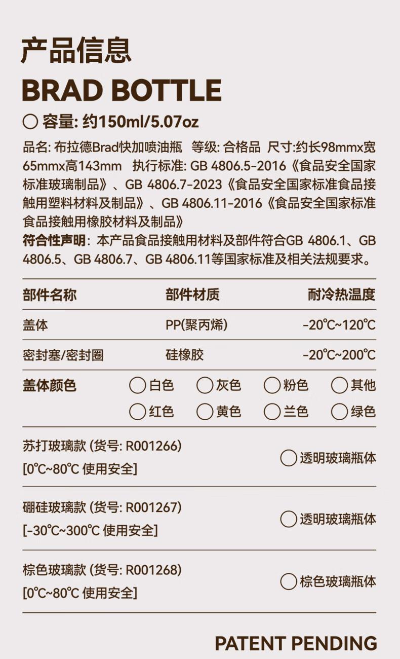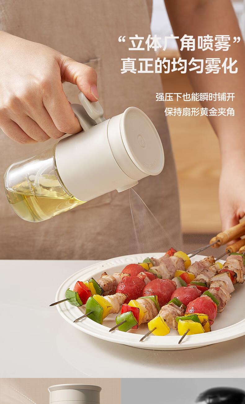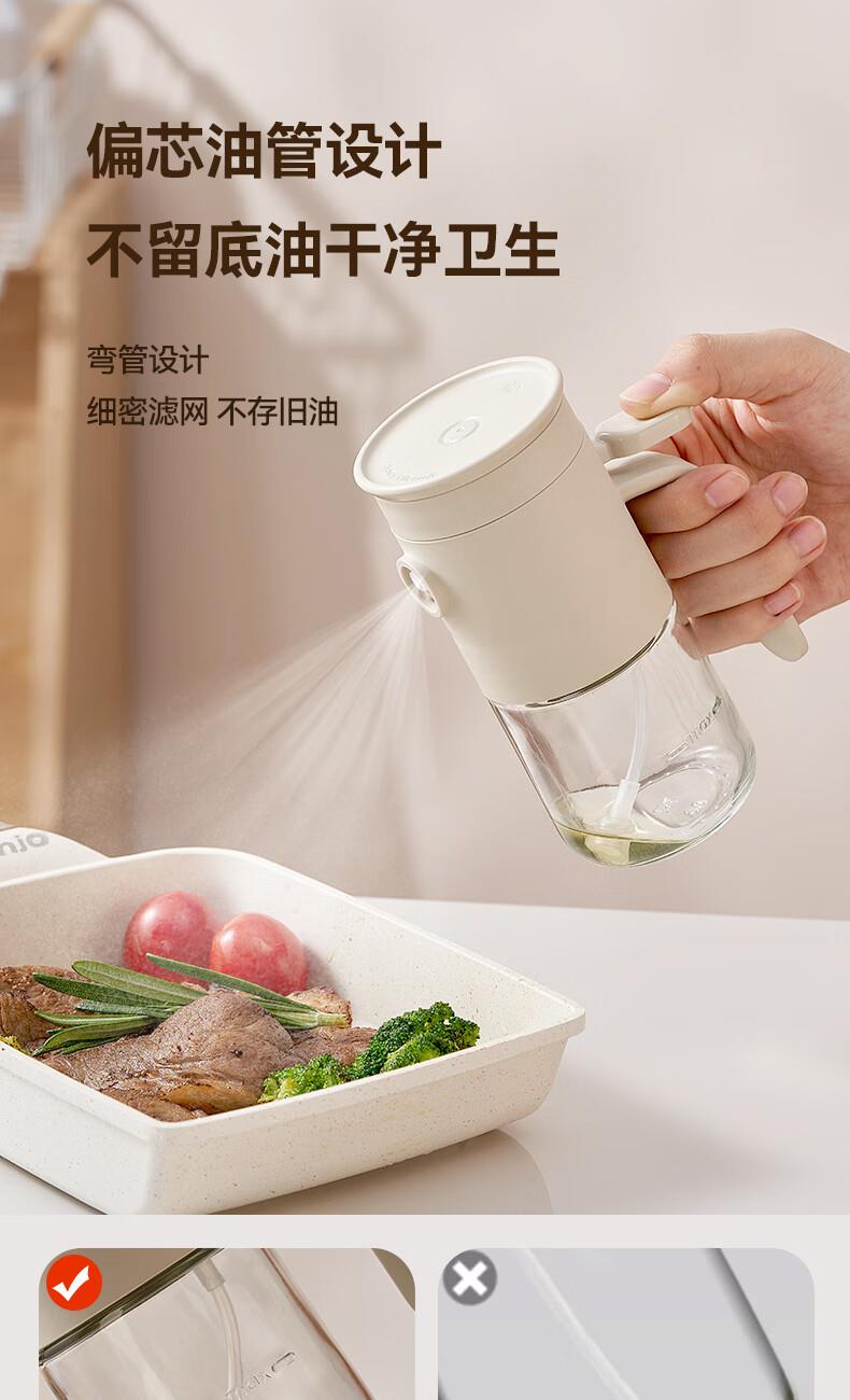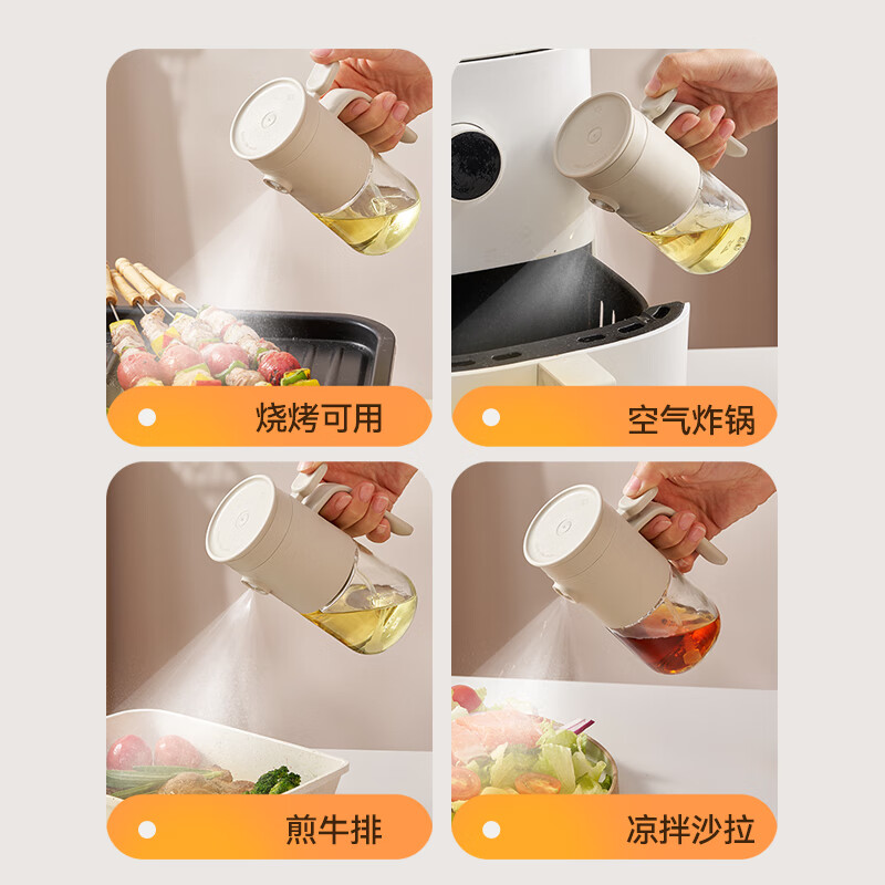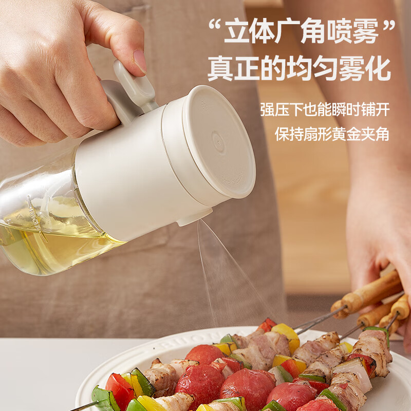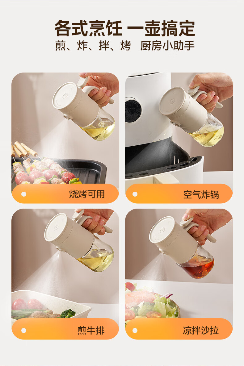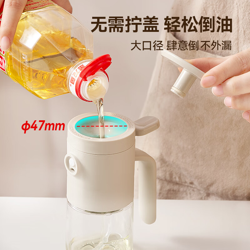 一提開蓋3秒加油霧化噴油 無需擰蓋 輕松倒油大口徑 肆意倒不外漏 “立體廣角噴霧”真正的均勻霧化 強壓下也能瞬時鋪開保持扇形黃金夾角 偏芯油管設(shè)計不留底油干凈衛(wèi)生 彎管設(shè)計:細密濾網(wǎng)不存舊油 頂蓋硅膠密封圈開合方便防塵 瓶體旋轉(zhuǎn)蓋密封不漏油