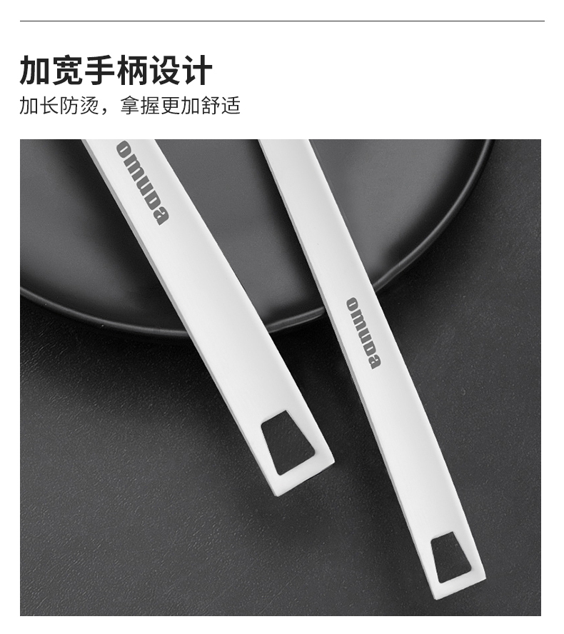 規(guī)格:兩件套、30cm 凈重:0.23kg/套 材質(zhì):304不銹鋼 ①采用優(yōu)質(zhì)304不銹鋼材質(zhì),堅(jiān)固耐用,人體工程學(xué)手柄設(shè)計(jì),防熱隔燙,手感更舒適 ②選砂光工藝處理,不易產(chǎn)生刮痕,圓筒狀手柄便于抓握,帶給您便捷的烹飪體驗(yàn) ③整體不銹鋼材質(zhì),易清潔,無(wú)衛(wèi)生死角,耐腐蝕、安全衛(wèi)生