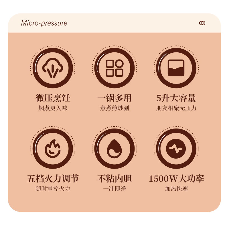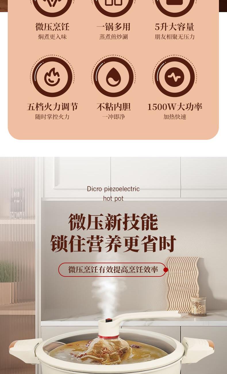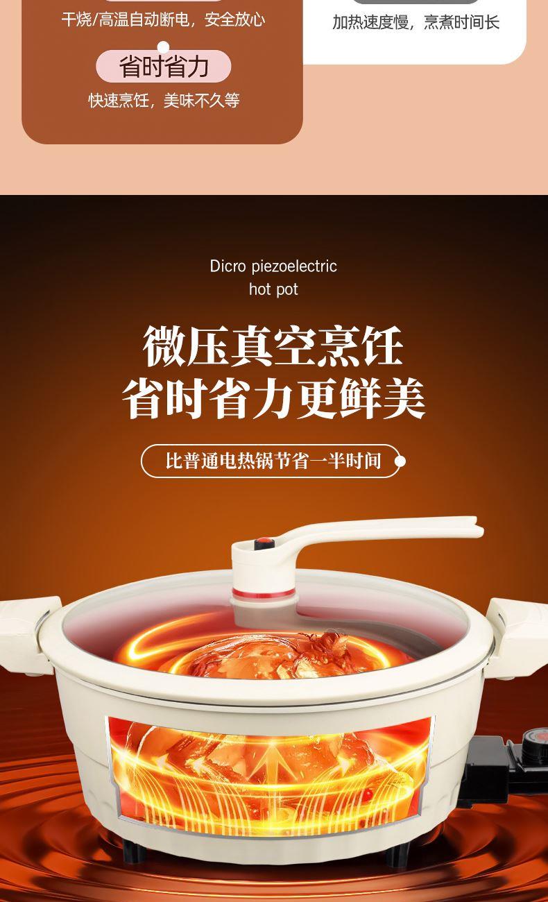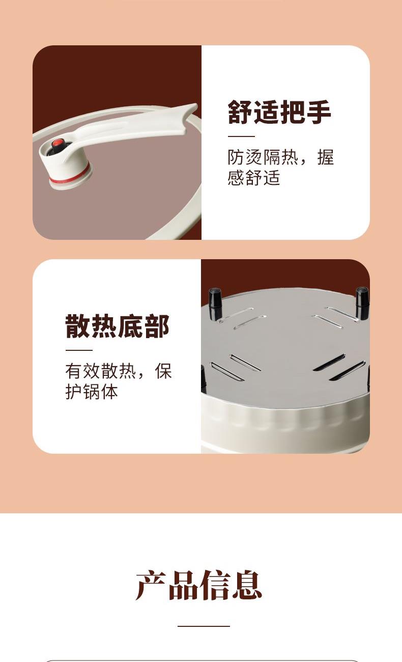 微壓省時(shí)省力,享受美味快人一步 升級(jí)真空微壓,斷火再煮10min 整圈硅膠密封圈設(shè)計(jì),真空蓄熱效果好 便攜式推拉式耳扣,安全防撲不擾人 1500W大功率,快速涮鍋真暢快 升級(jí)整圈發(fā)熱,整鍋加熱快速