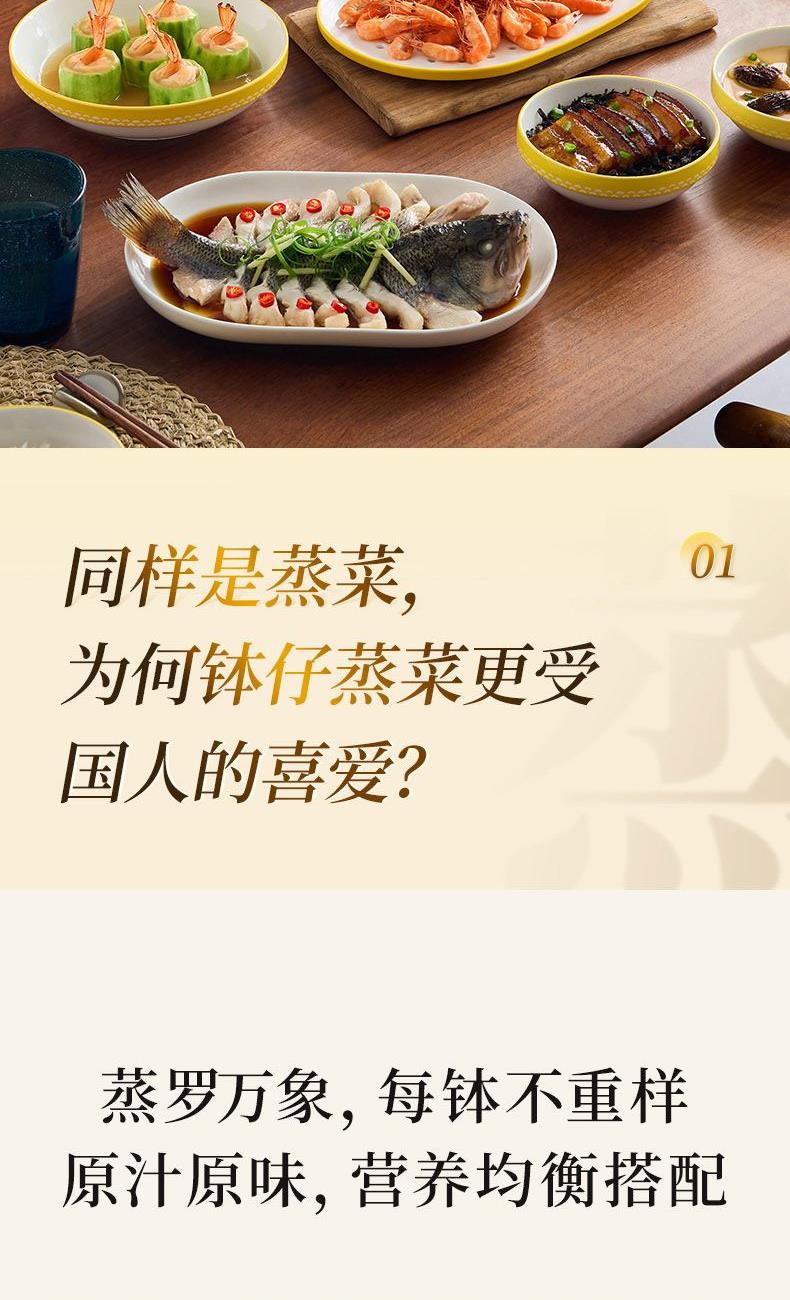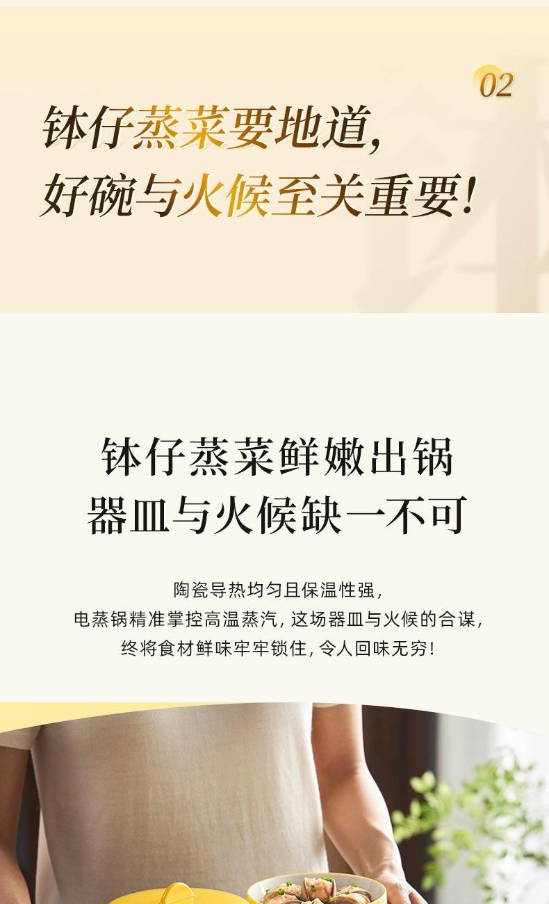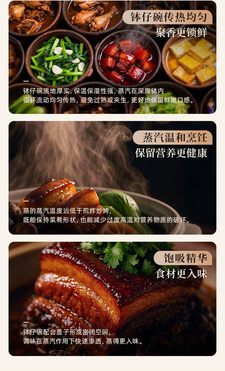 容 量: 直徑120mm、深度58mm 毛 重 : 1.75kg 產(chǎn) 品 尺 寸: 140*140*124mm 包 裝 尺 寸: 374*344*121mm 配 置: 缽仔碗*4、碗蓋*1 1.特色缽仔蒸菜,套疊收納,自成風(fēng)景 2.隔絕水汽,保鮮蒸煮營養(yǎng)不流失 3.3次1280℃高溫鍛燒 4.可烤可蒸可微波耐冷熱-20℃-250℃