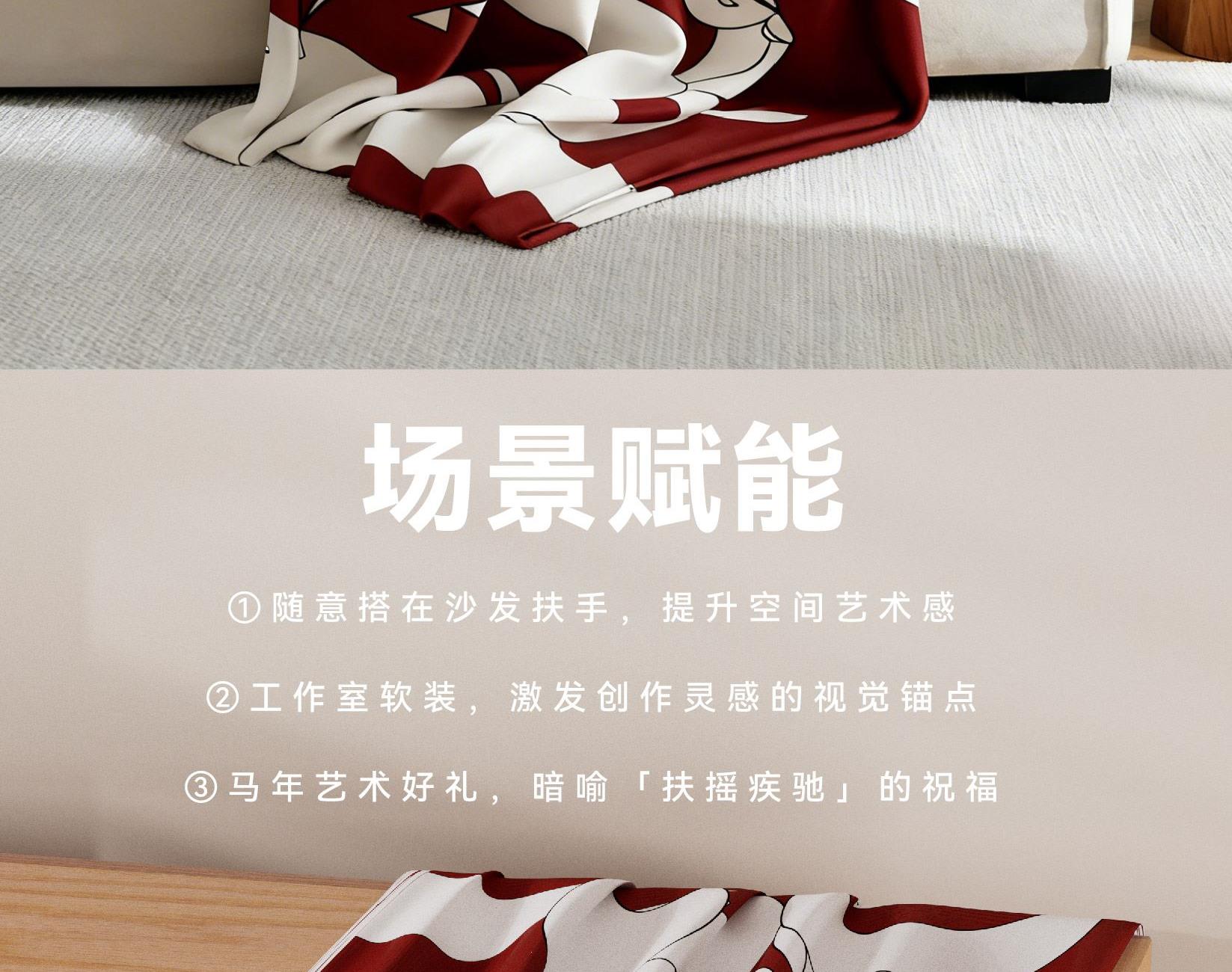 以抽象的線條與塊面,勾勒馬匹馳騁時的動態(tài)瞬間?!八嚲绸Y騁”不止于馬的意象,更寓意新年的奔赴與自由。幾何化的結(jié)構(gòu)語言,賦予傳統(tǒng)生肖當代的藝術(shù)表達。 馬踏流光,不擾塵寰,乘風而行,心向無際,愿新歲,步履從容如詩 規(guī)格: 80x130cm 材質(zhì):腈綸 包裝尺寸:380*290*90mm